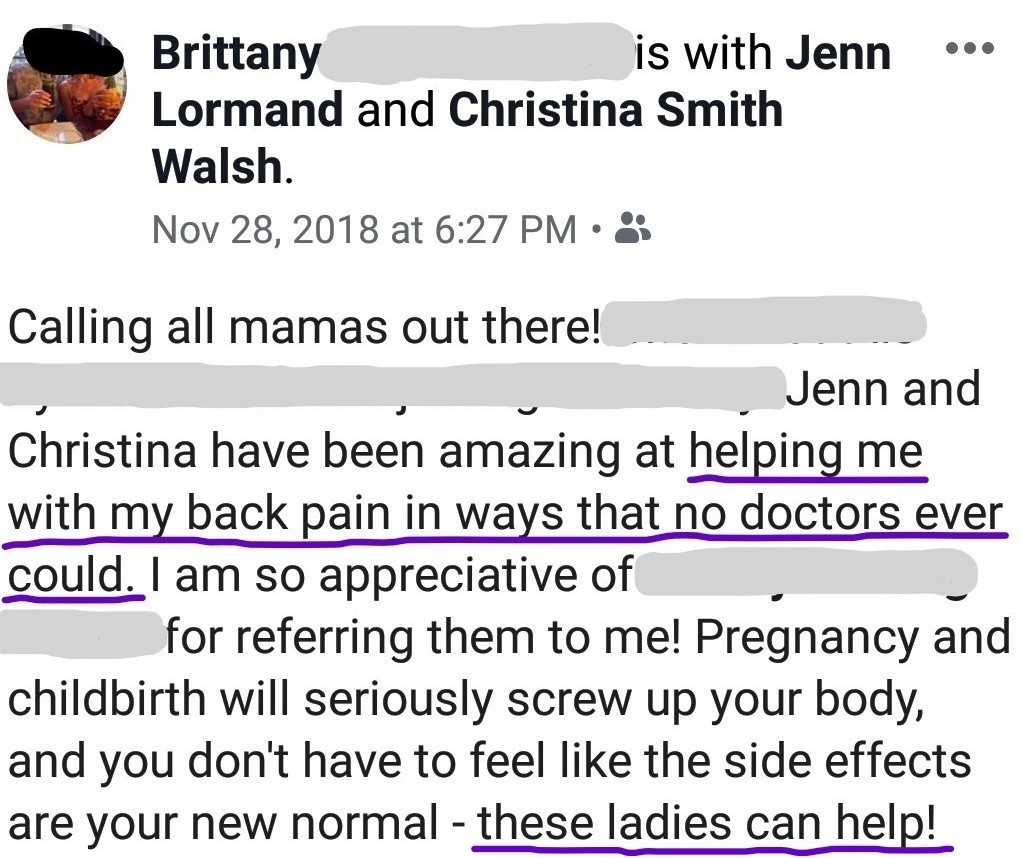 I was stuck in a funk with pain, and the last thing I wanted was to go through a series of doctors. I’ve been able to get back to where I was before with exercising again. I’m now doing exercises that are even more difficult than what I was doing before I was pregnant!